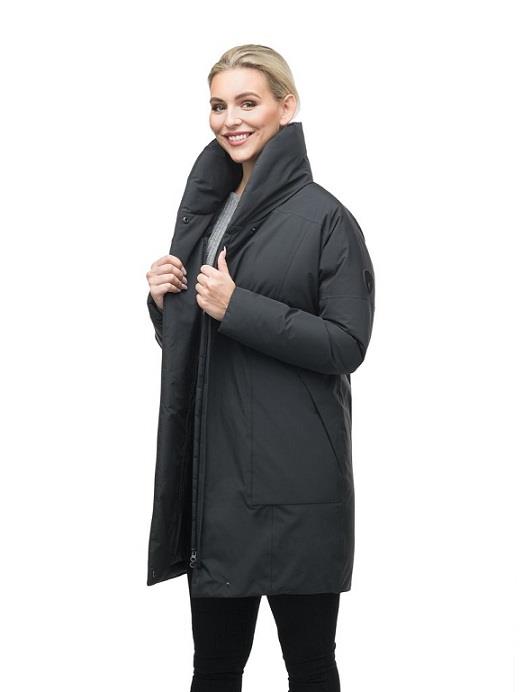 Fashion with a twist. The Alana offers a unique cocoon silhouette with a beautiful shawl collar detail for added warmth. Engineered with the Sympatex® membrane to provide a waterproof exterior. Insulation : Fuller cluster, higher loft, Premium Canadian Origin White Duck Down Fill for ultimate warmth. 10,000mm waterproof/breathable, windproof laminated membrane.