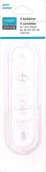 4 pack, clear, Class 66 plastic bobbins. For Singer sewing machines: 66-101-201-99-1200-401.